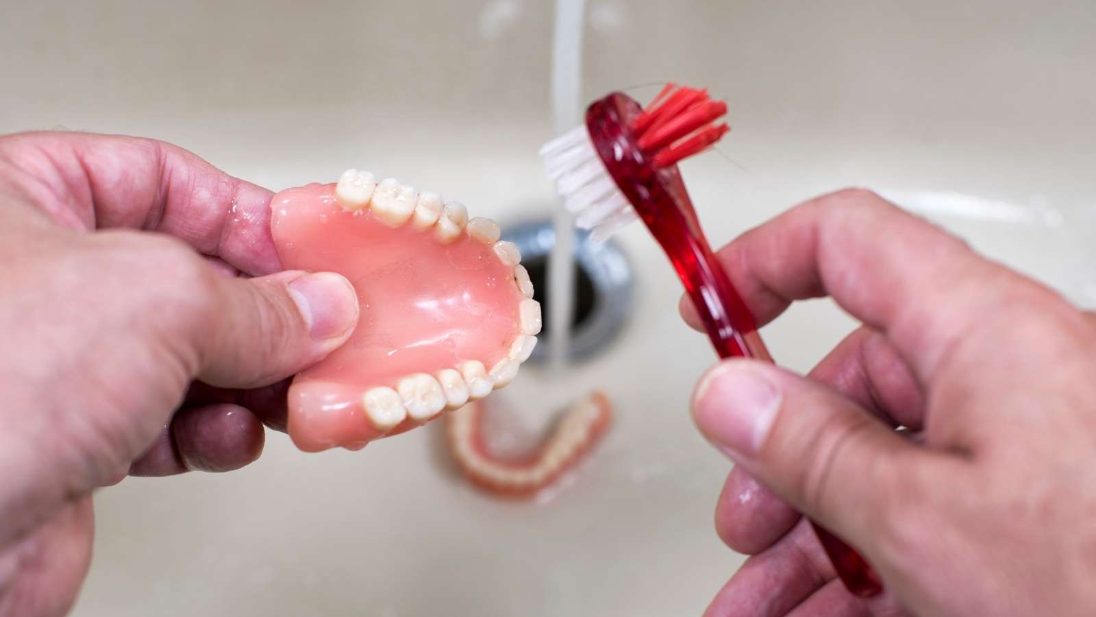 - Use gentle cleaning agents like dish soap to scrub your dentures clean.